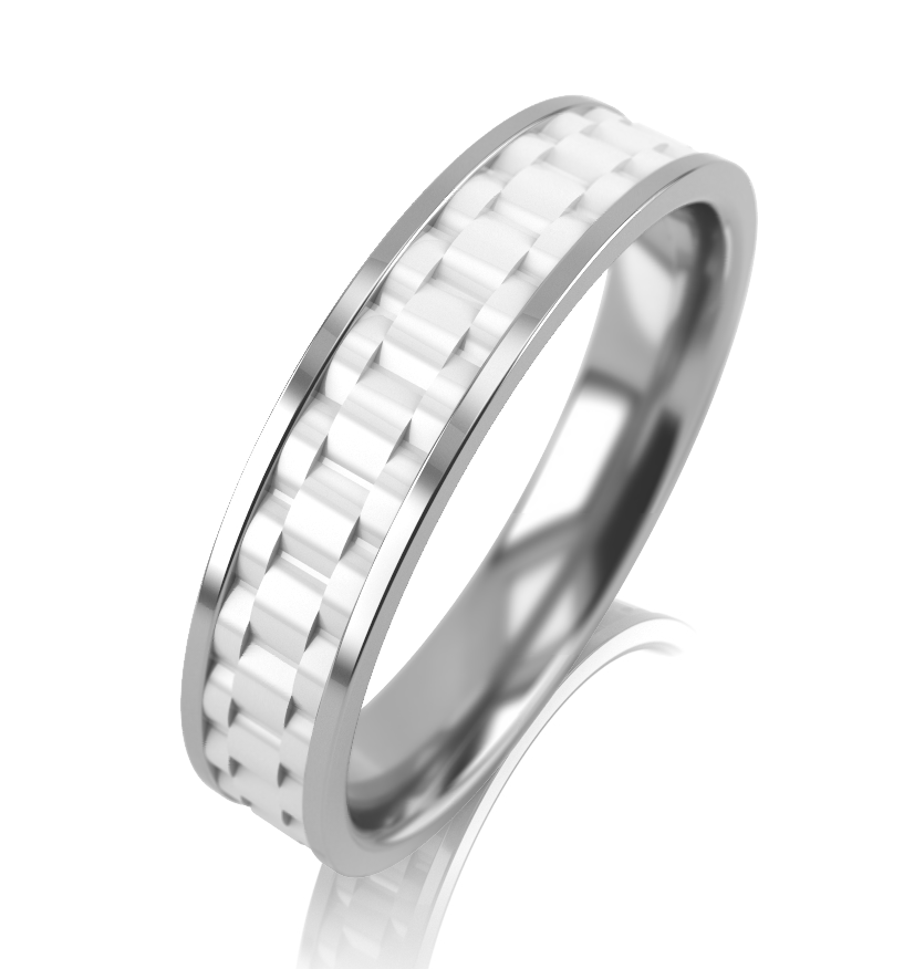 Обручальное кольцо, выполненное из белого золота 585 пробы в сочетании с белой керамикой, которая имеет оригинальную текстуру.