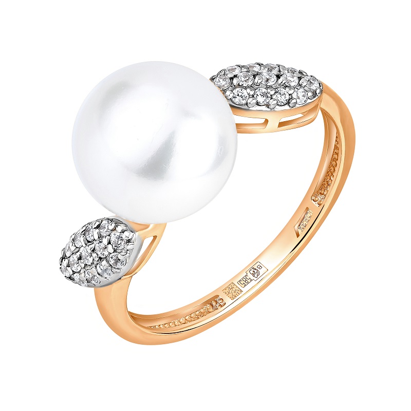 Кольцо из красного золота с жемчугом и фианитами